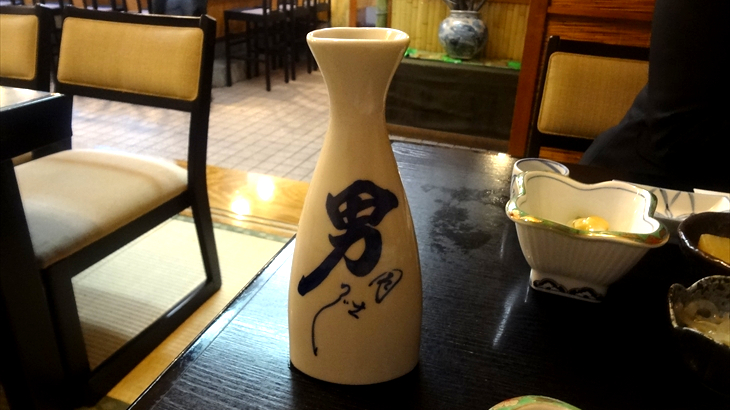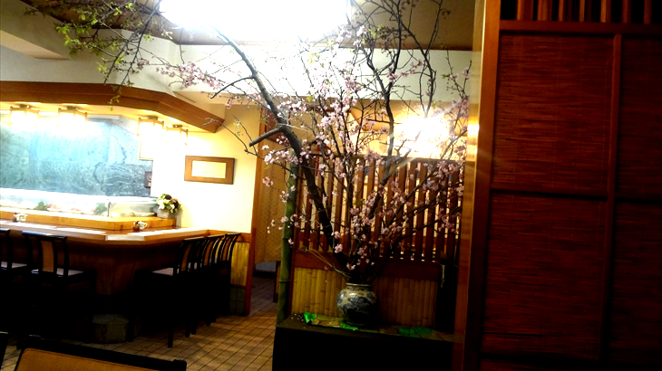 この日は少し風の強い日、暖簾が舞ってる入口をくぐると、桜の生け花でお出迎え。お座敷テーブル席に案内されました、まだ他のお客さまは誰もいません。寒かったので、熱燗2合と3000円の握りコースを注文。