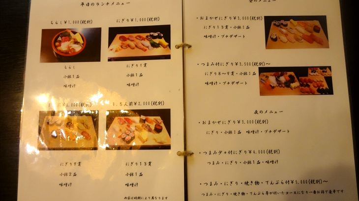 夜のメニューは3000円、4000円、5000円の握りコース、お刺身の付くコース3500円~5000円があります。いろいろなコースを試しましたが、夜は握り3000円のコースで十分というのが我が家の結論。