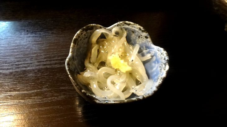 すぐに、熱燗と小鉢3品(大根煮つけ、貝と海藻の味噌和え、生シラスのお刺身)を頂いていると、最初の寿司下駄に握り5貫(マグロの赤身、大トロ、あなご、たい、帆立)が登場、大トロ、あなごは絶品。