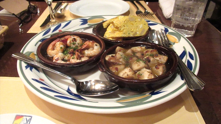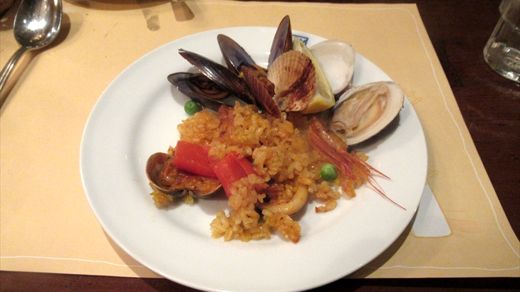 選択した3種類の前菜は、小海老のオリーブ油焼・スペイン風オムレツ・真だこのガリシア風だったと思います。ボリュームのあるバケットと一緒に頂いた後、メインの漁師風魚介類のパエリアが登場しました。