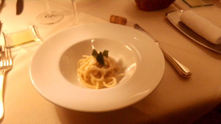 メニューは季節のスペシャルディナーコース(6980円)とルーチェコース(5400円)、アラカルトからの選択になります。ルーチェコース(5400円)と「パルミジャーノ・レッジャーノの器で和えたスパゲッティ(1640円)」を注文し、白ワインボトル(6500円)で乾杯♪
