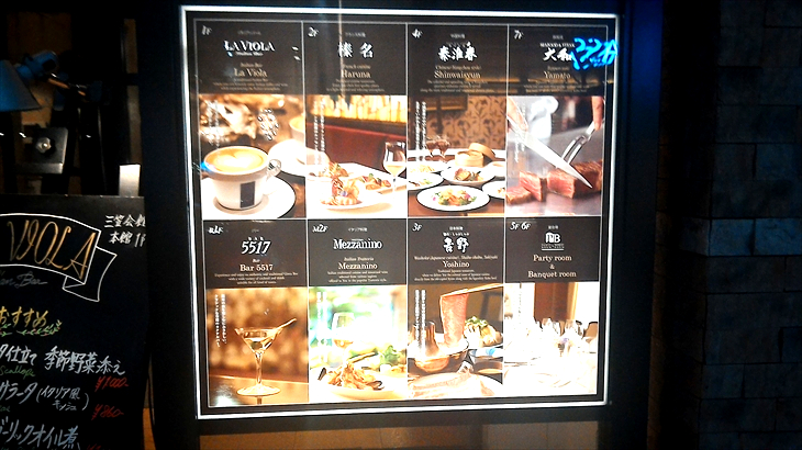 地下1階はカクテルバー「Bar 5517」、1階はイタリアンバー「Italian Bar LA VIOLA」、今回利用した中2階はイタリア料理「Trattoria Mezzanino」、2階はフランス料理「榛名」、3階は日本料理「吉野」、4階は中華料理「秦淮春」、32年前に結婚式を挙げた5階と6階はパーティールーム、7階は鉄板焼き「大和」。