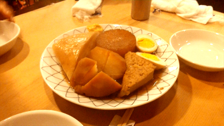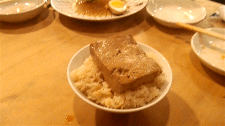 おでんは250円から500円、少し高めの回転寿司並みの価格。まずは、おでん6品とハイボール3杯を注文、大根とジャガイモが美味しかったです。看板メニューは「おでん茶飯」、たっぷりタレの焼き豆腐と茶飯が登場します、茶飯の上に豆腐を乗せ、タレをかけて頂くのが流儀。