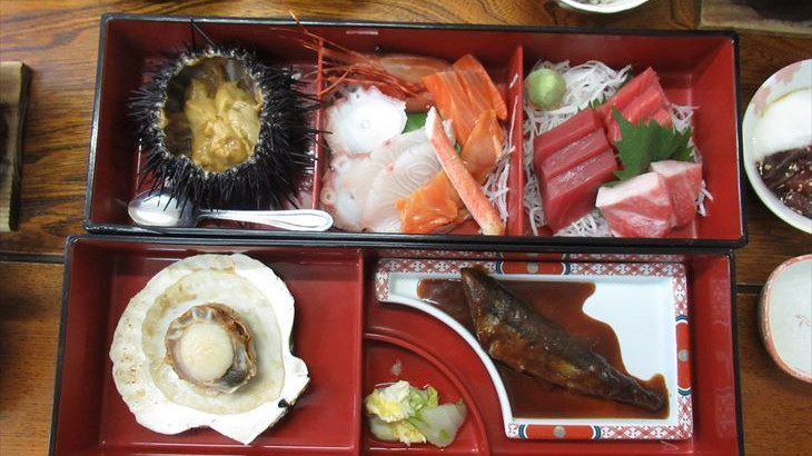 なんと盛りだくさん、大間ならでのマグロ、大きなウニもある、気仙沼の崎野屋も良かったけどはるかにそれを超える、陶板も2つ(すき焼き味海鮮のたまご閉じ、イカと牡蠣のバター炒め)あり最高。