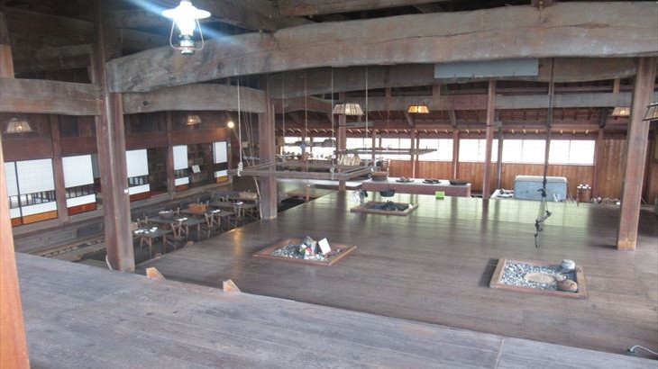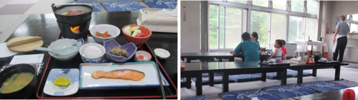 朝ごはんの食堂は広いお座敷と椅子席、昼間は日帰り温泉客の休憩所に変身。その内容もすごい、陶板は朝からすき焼き・・・