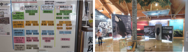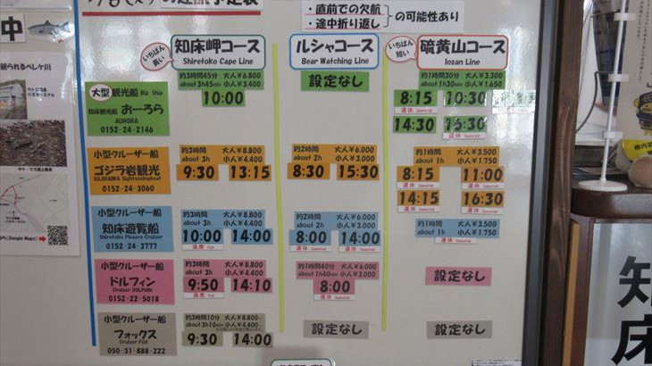 ウトロの街に到着したのは10:57。道の駅ウトロは新しく綺麗にこじんまり感あり、隣に併設されてた「知床世界遺産センター」では大きなパネルで知床の良いスポットを紹介していました。ここで掲載されてた知床観光船の時刻表、次の観光船は14:30発で1時間30分のコース(3500円)、時間的に難しいのでパス。積丹半島で乗った観光船とは比べられないほど立派、これなら乗っても大丈夫だったかな・・・・