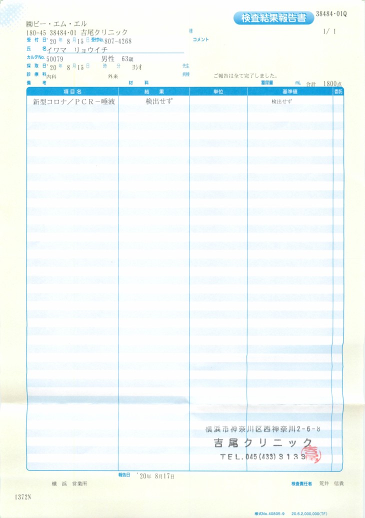 新型コロナ感染してないことを確認した上で今回の旅行を行うことにしました。8月15日に近所(東白楽)でPCR検査を行っている吉尾クリニックに電話してみました。何度電話してもつながらないので検査予約のために直接来院してみると、普通に予約するなら5日後の8月20日、たまたまキャンセルがあったのですぐ検査してもらいました。