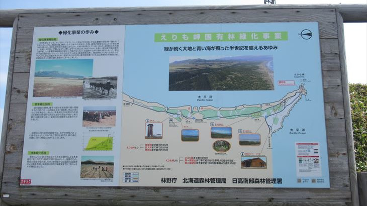 襟裳岬の手前の百人浜展望台、駐車場から徒歩で3分ぐらい。ここは砂漠と言われていたところに植樹して緑多い場所に変身させた景観地という解説がありました。