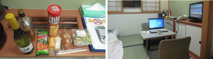 乗船し、予約していた個室和室へ、船内探検などしてるうちに出航~~。コンビニで買い込んだワインと食料をお部屋で頂きながらブログ作成、船揺れるし・・・・