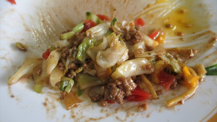 目玉焼きと赤い福神漬けがトッピングされるのが特徴。焼きそばの具は、ねき・キャベツ・ひき肉のみじん切り、きっと特製ソースなのでしょう。570円、美味しかったよ・・・・