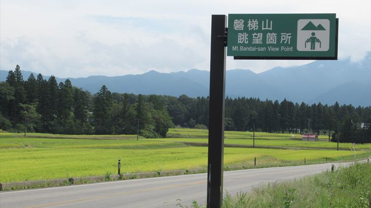 朝8時、小野川温泉出発。ドライブしやすい国道を走りラーメンで有名な喜多方市を経由、福島県の磐梯山眺望箇所として指定されてるところに9時56分到着、この場所での写真撮影が本日最初の観光です。