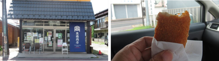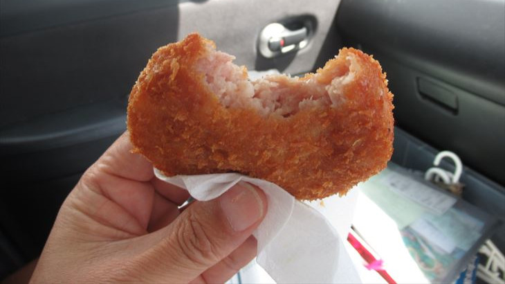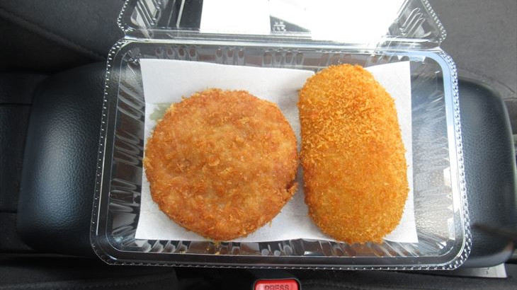 龍ケ崎コロッケは第2回『ご当地メシ決定戦!2014』で日本一を獲得。その代表ともいえる龍ヶ崎の高橋肉店にいきました。本日の昼食はコロッケとメンチです。注文してから揚げてくれ、特製包装してくれました。
