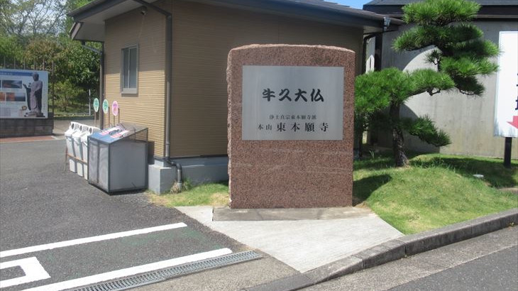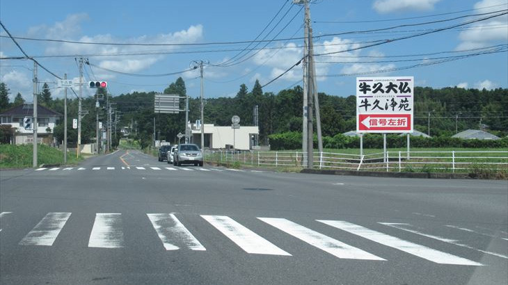 高橋肉店から牛久大仏までの距離は10km程度、交差点の看板を曲がると突然、大仏様が登場しました。到着したのは12:21。圧巻の大きさ、綺麗な公園のように手入れされた庭園。牛久大仏の胎内見学も行いました。