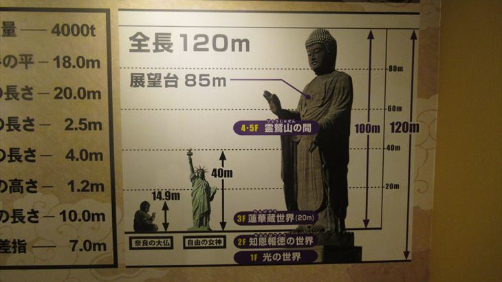 牛久大仏の高さは120m。エレベータで胸位の高さ(多分90m位?)まで登り見学、やはり怖い。胎内にはたくさんの大仏像が奉納されてました。大きいのが100万円、小さいのが30万円・・・