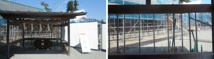 全国に約500社ある「阿蘇神社」の総本社、全面改装中でした。仮設の本殿と参拝所、こんなに苦労して訪れたのに・・・