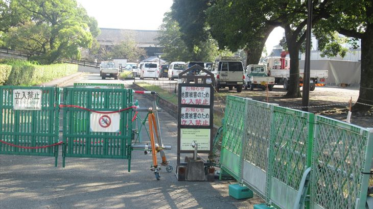 ここから修復中の熊本城が良く見えます。ここで記念写真をたくさん撮影して熊本城見学は終了しました。加藤神社の前から熊本城への道は閉鎖、そこに工事の方用の宿舎がありました。