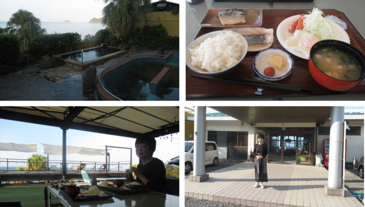 露天風呂からの景色をみながら温泉、恒例の朝風呂、気持ちよし。7時30分からテラスで朝食、一層美味しく感じました。そして8時に出発しました。