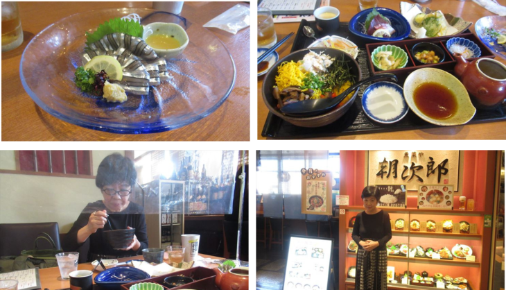 天文館からバスに乗り鹿児島中央駅に12:15到着。律子さん帰りの切符を買い、お土産見学してランチしました。どうしてもきびなごのお刺身が食べたい・・・