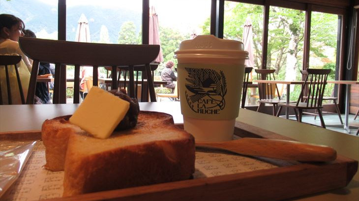 湖を見ながらCAFE,お洒落だったので小倉バターパンとコーヒーで休憩&昼食。
