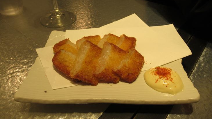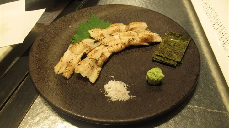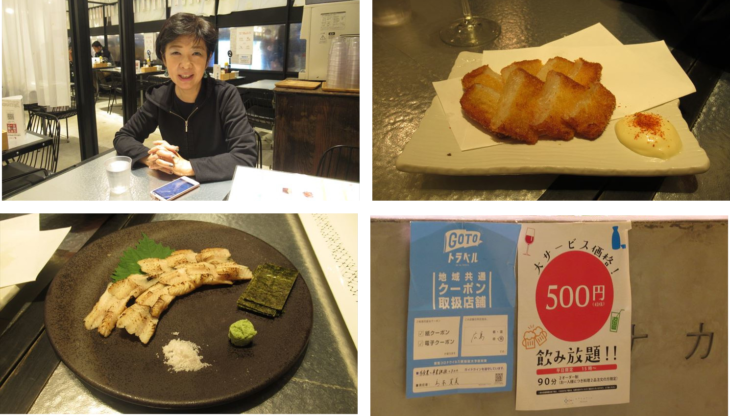二次会は同じフロアのアナゴの白焼きが食べれるお店で白ワインとじゃこ天揚げをいただきました。18時17分、律子さん最終列車が近いのでお開き。