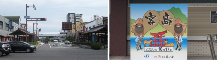 宮島に到着したのは12:40ころ。人気の世界遺産、土曜日なので観光客で一杯、駐車場の空きがありません。JR宮島口駅前は綺麗に整備。フェリー乗り場の前の広場が工事中でした。