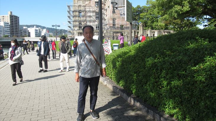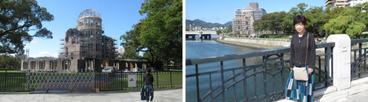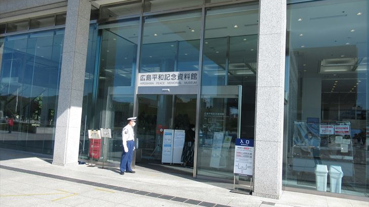 平和記念公園に到着した13時40分ころはすっかり快晴になりました。現在メンテナンス中の原爆ドームを見学、慰霊碑を撮影したりして平和記念資料館に向かいました。平和記念資料館はとっても混んでいました。