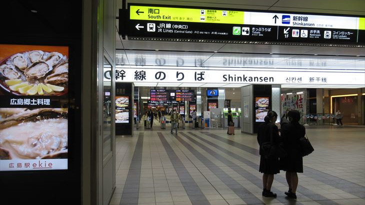 車を駐車場に停め、宮島までフェリーで渡るのが通常の観光スタイルと現地で初めてしりました。時間もかかりそうだったので、宮島上陸を諦め、駅前で記念写真、もみじ饅頭を食べ広島に向かいました。