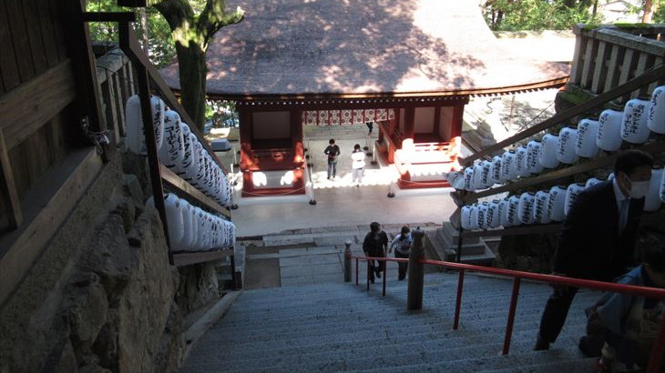 桃太郎伝説の関係の深い吉備津神社、訪れてみました。階段の参道を登り本殿でお参り、本殿横に木の屋根がある道があったのでゆっくりと歩き神社の雰囲気を確かめました。