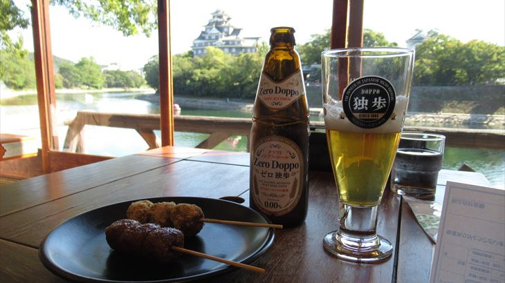一通り見学を終え、後楽園の裏門のお堀端にある休憩所でちょっとブレイク、きび団子とノンアルでおやつしました。