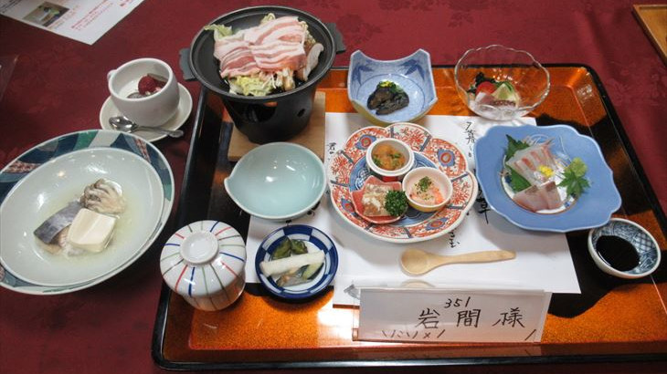 温泉に入って18:30から夕食、瓶ビールをお願いして頂きました。夕食会場には4組、10名程度でしょうか。