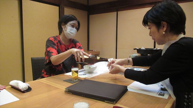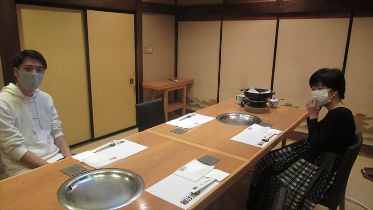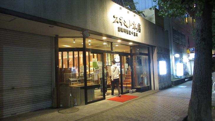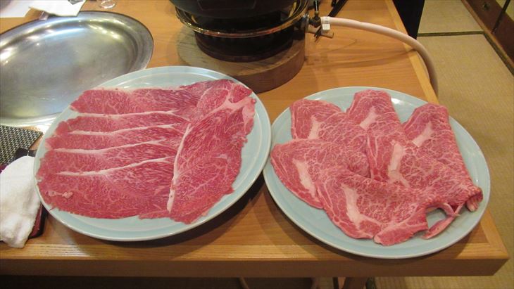 本日の夕食は創業明治33年のお肉の専門店老舗「スギモト本店」ですき焼きです。19:08に到着、2階の味わいのある個室に案内されました。スギモト牛の霜降りコースと松坂牛の赤身コースをそれぞれ2人前を注文、エビスビールで乾杯して夕食が始まりました。