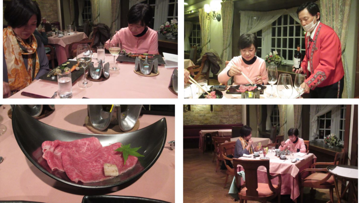 最初にエビスビールで乾杯~~。楽しく夕食がはじまりました、白ワインボトルをお願いして前菜、スープ、お造り、お魚料理「海老のロースト」、お肉料理がメイン、飛騨牛の焼きシャブ、自分で焼いて頂きます。