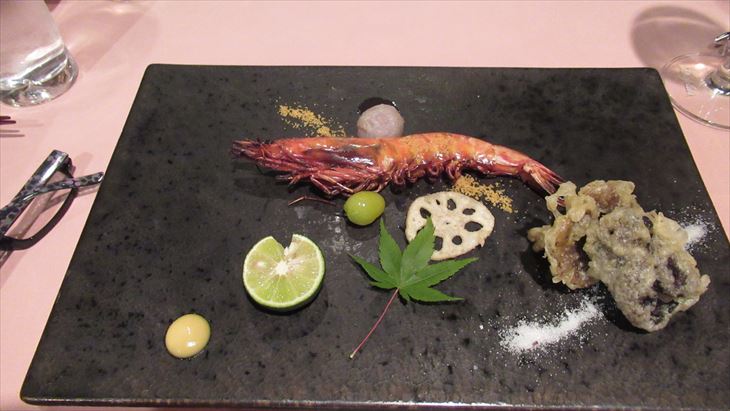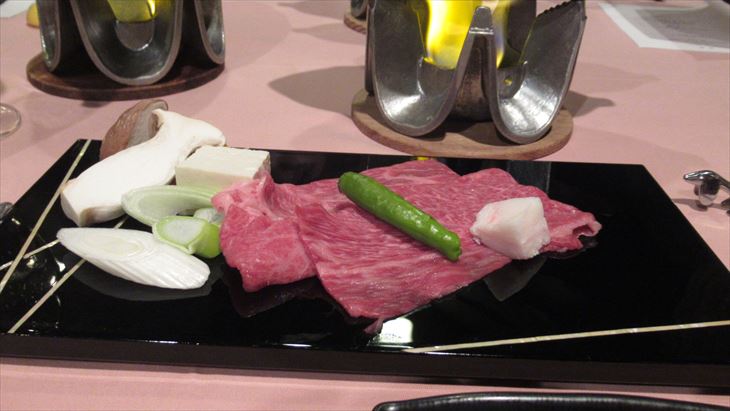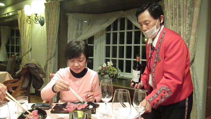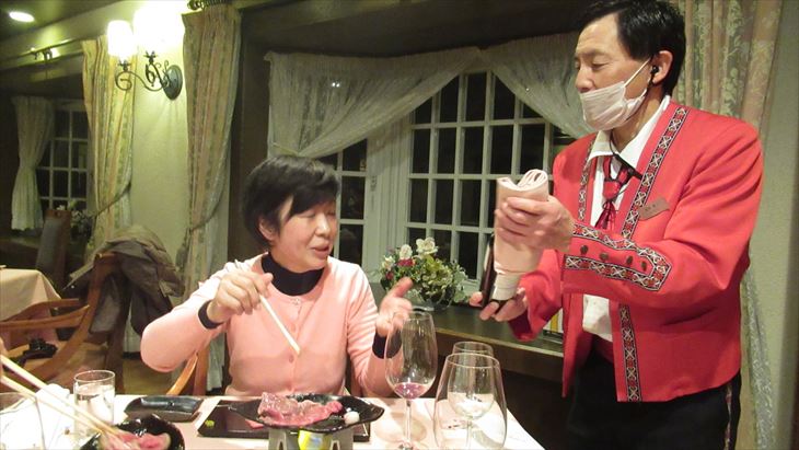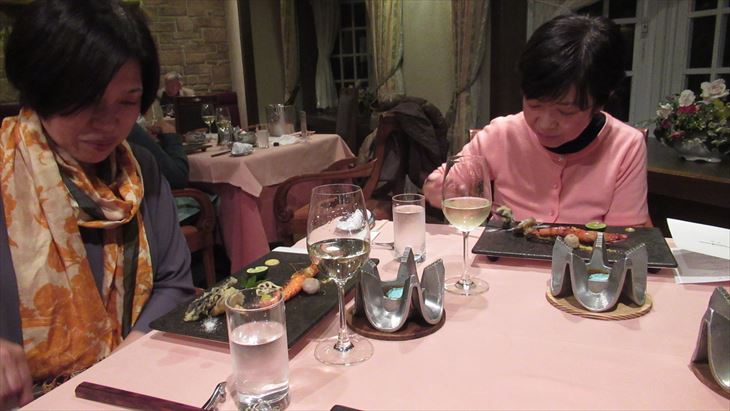 最初にエビスビールで乾杯~~。楽しく夕食がはじまりました、白ワインボトルをお願いして前菜、スープ、お造り、お魚料理「海老のロースト」、お肉料理がメイン、飛騨牛の焼きシャブ、自分で焼いて頂きます。