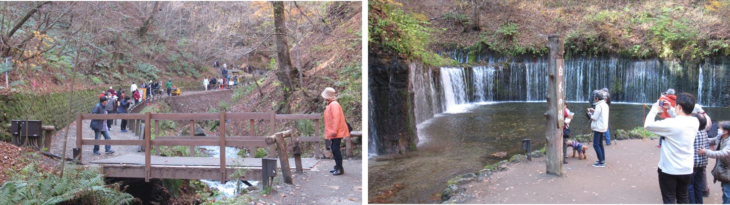 ここも観光客で混んでた。白糸の滝はどこから水が流れてこうして一定に流れるのだろう?
