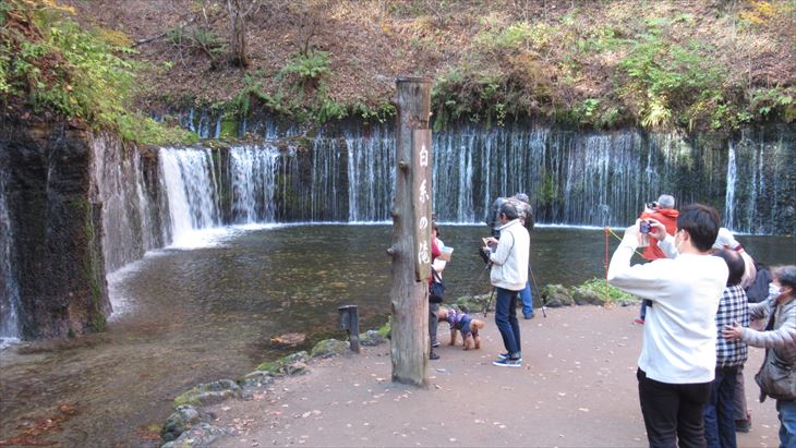 ここも観光客で混んでた。白糸の滝はどこから水が流れてこうして一定に流れるのだろう?