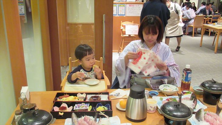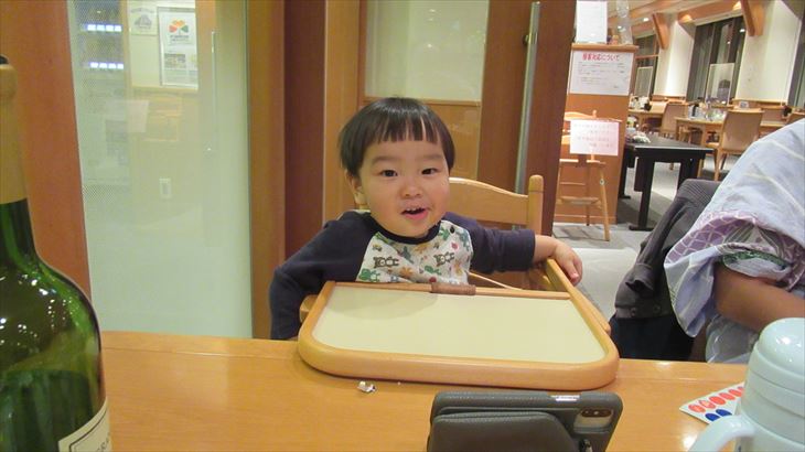 夕食は18:30、夕食会場に行くとそこは満席。お刺身がドーンと待ち構えていました、利太郎くんはお子様ランチ。白ワインを注文し、お食事が始まりました。「田舎料理プラン」のコース、なにしろ沢山のお料理が登場してきました。