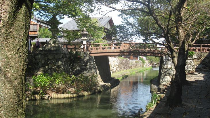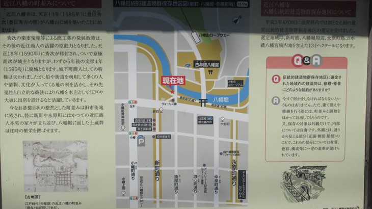 「八幡堀」を目指して到着した駐車場が日牟禮八幡宮(ひむれはちまんぐう)前、最初にここでお参りして近江八幡の町を散策、川が流れていてそれがテレビでみたことのある景観、ここが「八幡堀」なのですねと理解。