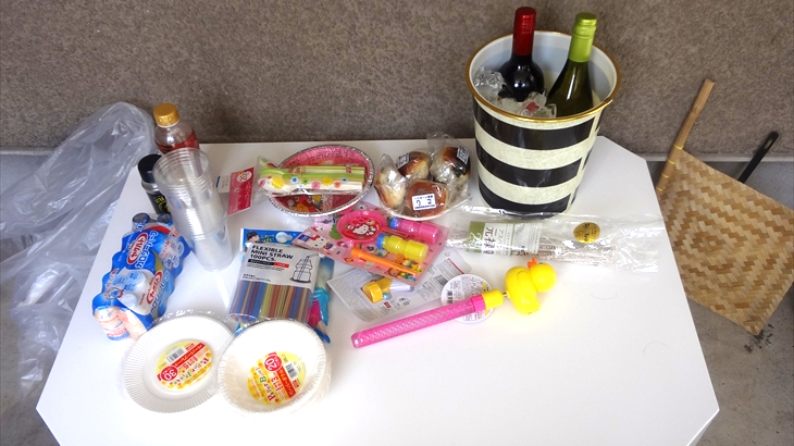 お買いものは近くのスーパ開店時間の10時に合わせ車で向かいました。約1時間で一通りの食材を購入し一端自宅戻り、100円ショップで紙皿、着火材、網、シャボン玉等の不足品を追加購入、BBQの網を含め基本は全て使い捨てです。