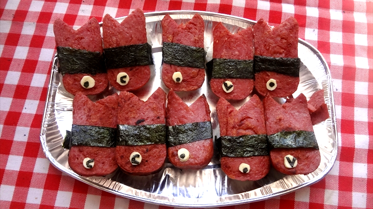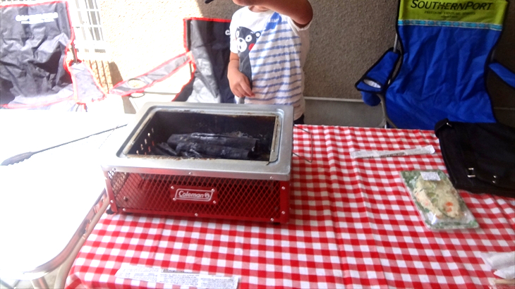 鯉のぼりを型とったスパムおむすび、春キャベツの温玉添え、本マグロのお刺身、ポテトサラダがBBQテーブルにセットされ、これらを頂きながら炭火焼きの開始です。