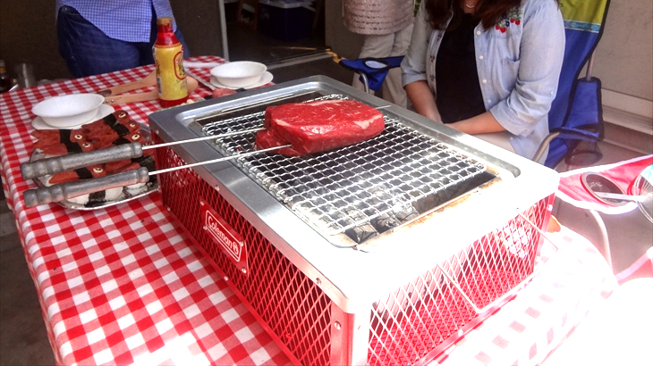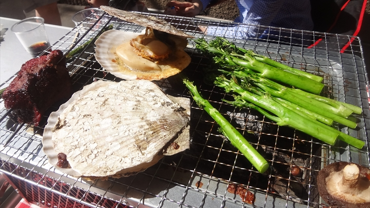 2時間ほど経過、帆立焼きが4個捌けたころ、シラスコを切り分けたり、通常家の鉄板で焼肉を行う時に購入する薄切り黒毛和牛を焼き始めました。
