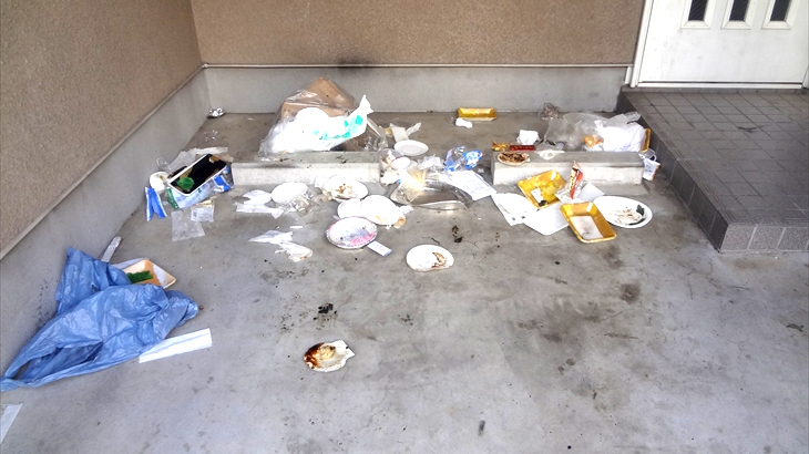 次の日の朝、ドヒャー!。ガレージの後ろに置いたゴミ袋、野良ねこに荒らされ、ガレージ一杯にゴミが散乱。ホースで散水、デッキブラシでゴシゴシ、大変でした2回目の後片付け。