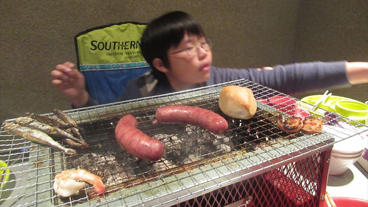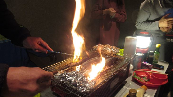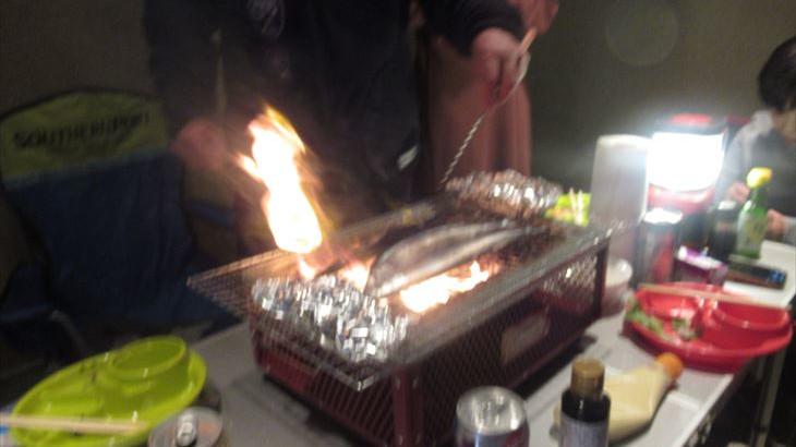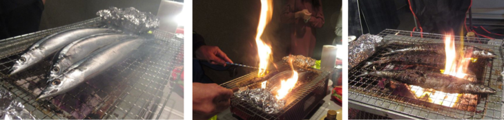 本日のメイン、秋刀魚の炭火焼きは20時から始まりました、脂が滴り落ち火柱が発生、モクモクと煙が充填、秋刀魚の炭火焼きの醍醐味です。焼きあがった秋刀魚を特性の昆布醤油で美味しく食べました。