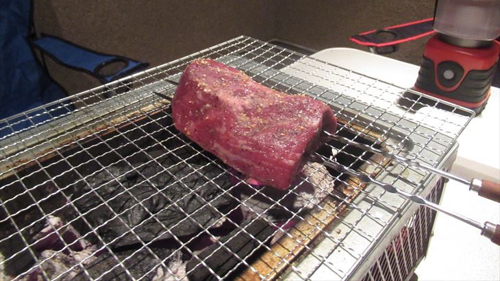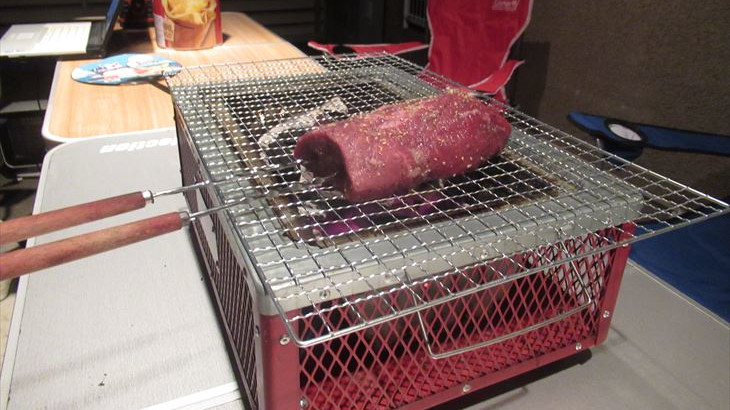 18時ころから炭起こし開始。最初はオージービーフの塊肉でローストビーフ作り、お肉の表面をコンガリと焼きアルミホイルに包み余熱で完成のところ、アルミホイルに包みコンロの上に約30分くらい置きっぱなしにしてしまったので中まで完全に火が通り固くなって大失敗・・・涙