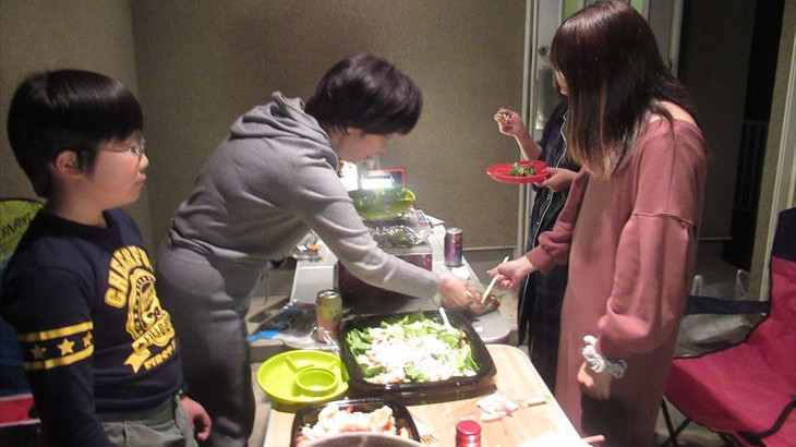 19時ころから食事が始まり、コストコ購入品はすべて好評。特にシュリンプ・シーザサラダが人気だったようです。