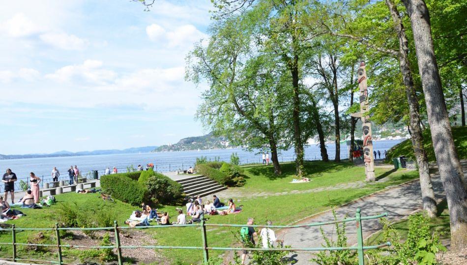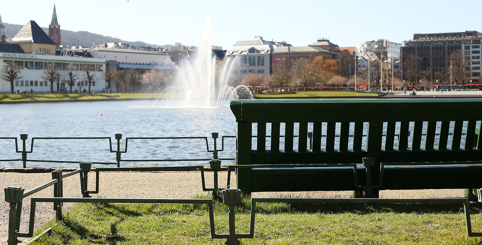 ベルゲン中央駅目の前に広がるのが、この中央に湖が設えられた大きな公園。湖の中央には噴水も備えられ、ベルゲン市民の憩いの場となっています。湖に面して多くの木製ベンチが設置されているのもポイントが高く、訪れた日は天候も良く、多くの人々がベンチで談笑しているのを目にしました。