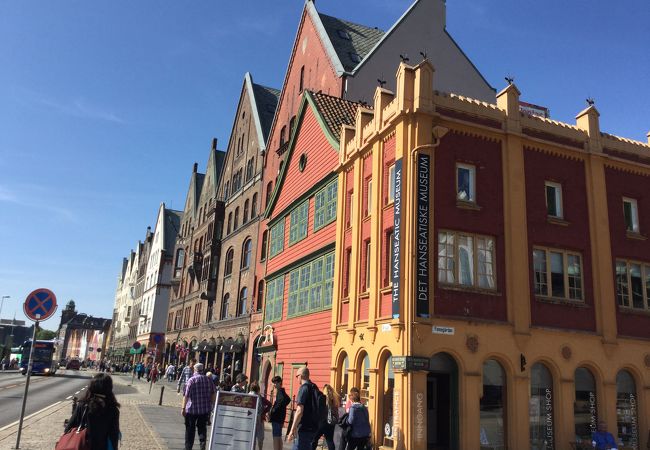 ベルゲン港の東側にあるブリッゲン地区は、ベルゲンで一番人気のある観光地。その美しい街並みは1979年に世界文化遺産に登録されています。14世紀にハンザ同盟のドイツ商人たちがやってきてドイツ街を作った場所です。ブリッゲンとは倉庫という意味があり、ハンザ同盟のオフィスや倉庫だった場所なんです。