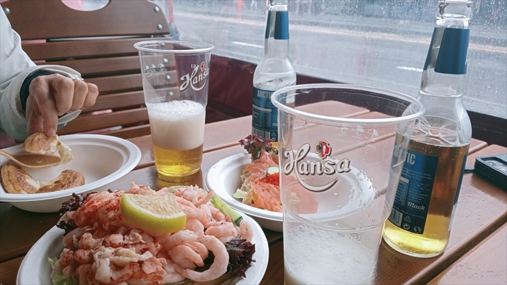 小エビ乗せパン、サーモン乗せパン、フィッシュスープ、フィッシュケーキで約6800円、スーパーで1本730円の小瓶ビールが2本で3800円と観光地値段です。