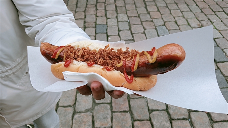 ケーブルカーで麓に戻ったのは17時30分頃、ベルゲン駅方面に向かい街歩き、途中フランクフルトがビックなホットドックに遭遇。美味しそうだったので食べました。