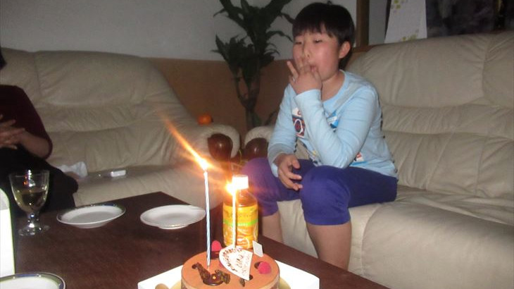 お誕生日の儀式は20時40分ころ。灯りを消して、ローソクに点火、Happybirthdayを歌い、フーして、記念撮影。11歳をお祝いしました。