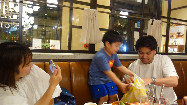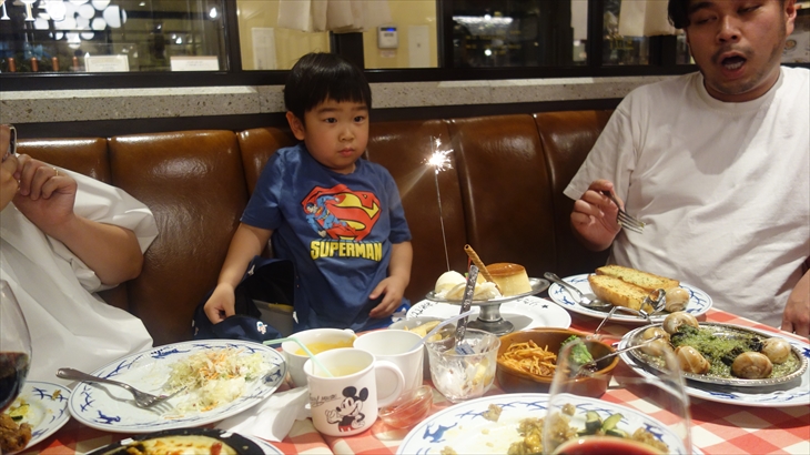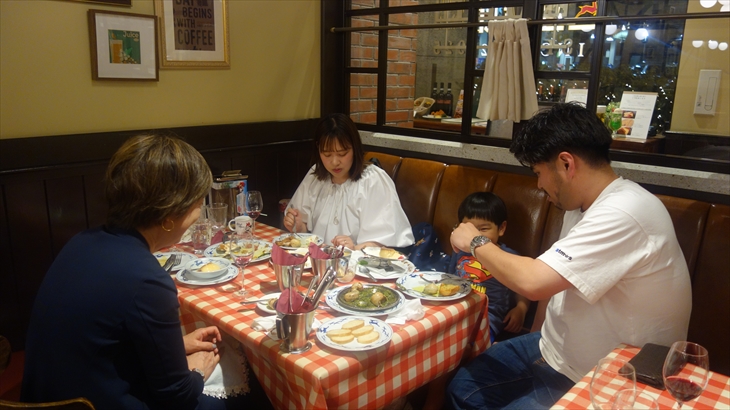 約1時間ほどしてパパが登場しました。プレゼントが入った大きな袋に利太朗くんハイテンション、たくさんのプレゼントに大喜び、ドライカレーやエスカルゴを注文して会食は続きます。